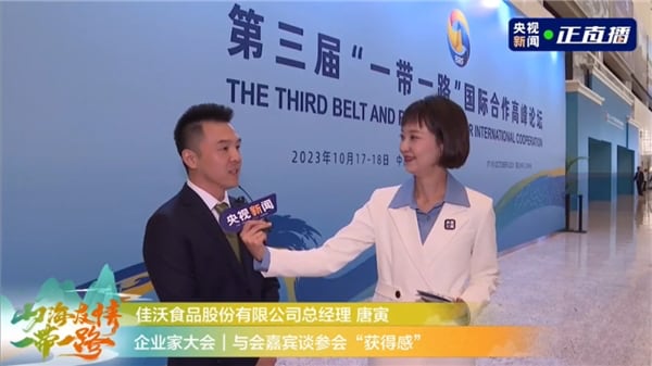 10月17日至18日,第三届“一带一路”国际合作高峰论坛在北京举行。作为高峰论坛的开场活动,由中国贸促会、国务院国资委、全国工商联共同主办的“一带一路”企业家大会17日下午在国家会议中心举办。佳沃食品作为农业领域的优秀企业代表应邀参会,会后,总经理唐寅接受了总台央视新闻记者的采访。