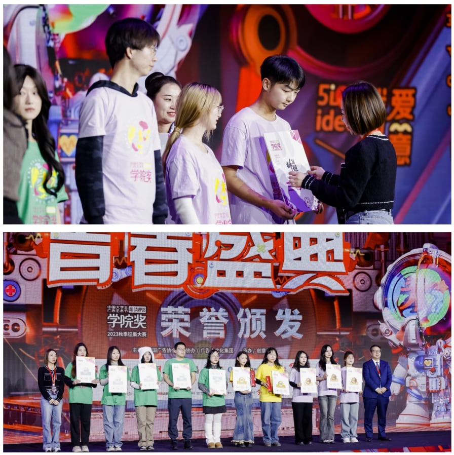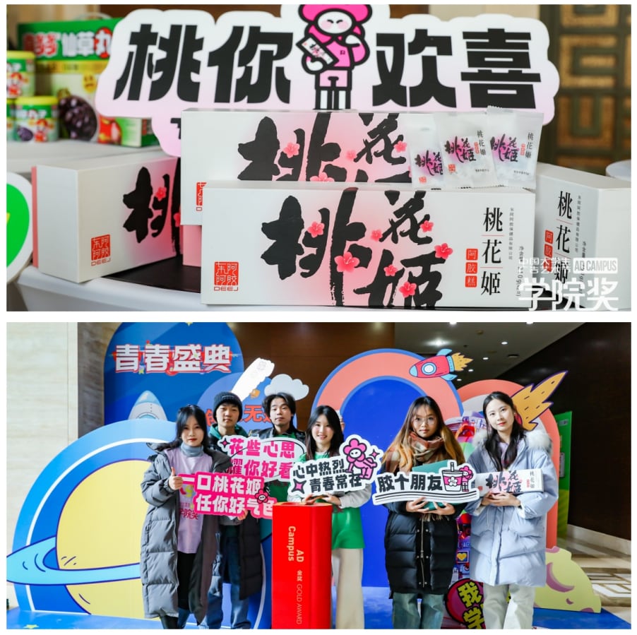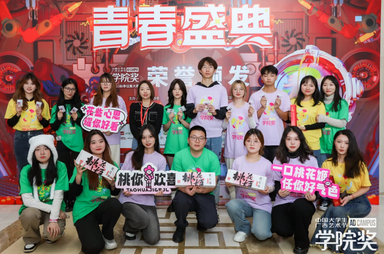 东阿阿胶股份有限公司桃花姬产品经理邱爽女士应邀出席大广节学院奖2023秋季青春盛典,上台揭幕创意大奖和传播大奖的归属,并与获奖学生合影留念。