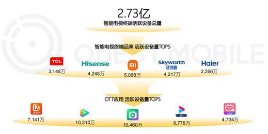 questmobile发布的《中国互联网核心趋势年度报告2023》显示,ott及智能硬件的广告份额不断增长的情况下,在智能电视终端现存2.73亿的活跃设备中,小米ott以5088万台的活跃设备量拔得头筹。