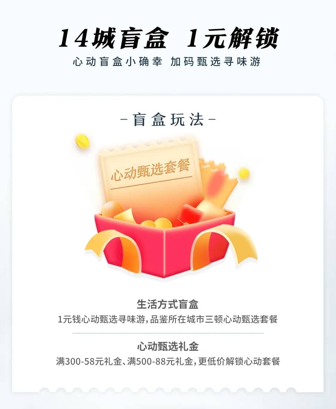 即日起至1月31日,「心动甄选活动周」限量发放“心动甄选盲盒”,送出满300元减58元礼金、满500元减88元礼金的心动甄选礼金,参赛用户还有机会1元赢取心动甄选寻味游,品鉴所在上榜城市3顿心动甄选套餐。14城盲盒1元解锁,心动选手抓紧报名,也许下一个幸运锦鲤就是你!