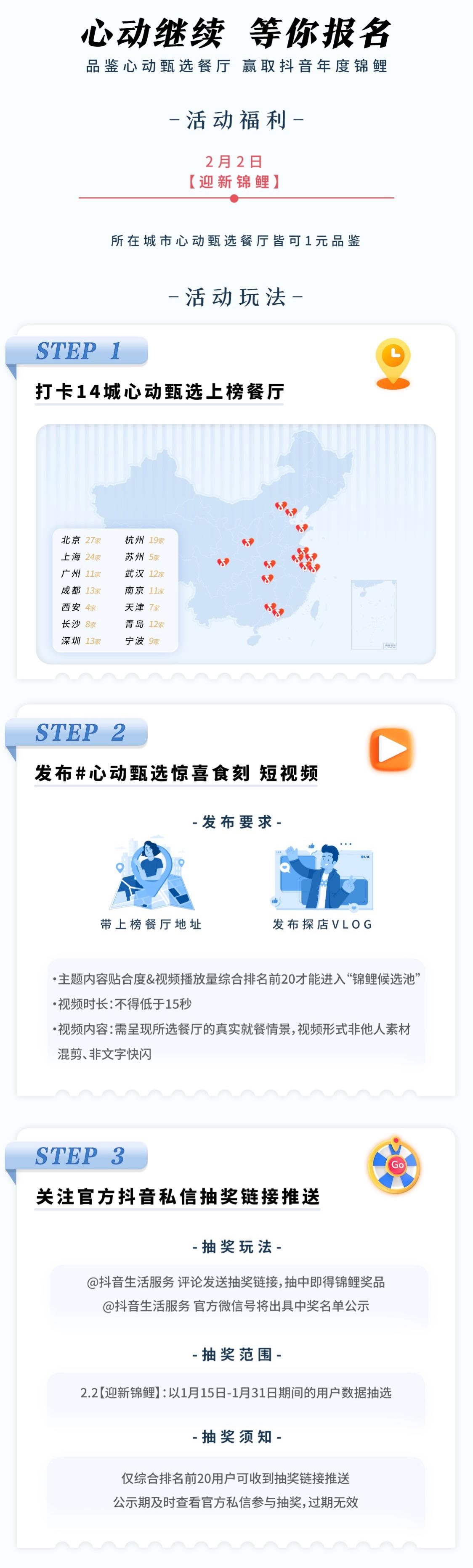 自1月18日至1月31日,覆盖北京、上海、广州、深圳、成都、杭州、苏州、西安、武汉、长沙、南京、天津、宁波、青岛等14个城市的175家心动甄选餐厅,任选打卡其中一家,在品鉴心动美食的同时,完成三个步骤,就有机会成为下一个“心动甄选年度锦鲤”!