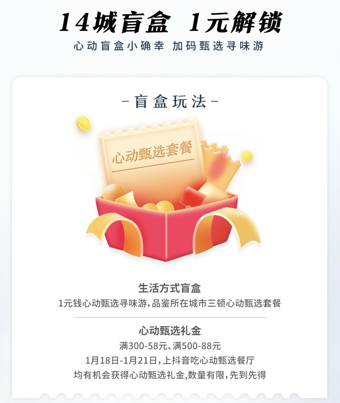 即日起至1月31日,「心动甄选活动周」仍将持续限量发放“心动甄选盲盒”。1月18日-1月21日,上抖音吃心动甄选餐厅,有机会领取满300-58元、满500-88元心动甄选礼金,助力抢赢年度锦鲤大奖!参赛用户还有机会1元赢取心动甄选寻味游,品鉴所在上榜城市3顿心动甄选套餐。14城盲盒1元解锁,心动选手快来报名!