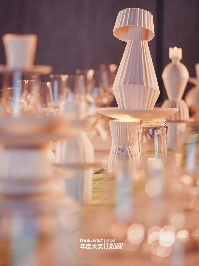 延续第一届「food&wine 年度大奖」,陶瓷工作室「errance 出走」的两位艺术家黄祎洁、陈翔为本届大奖特别设计了奖杯。沿用解构手法,奖杯设计尝试打破水平堆叠,利用斜面错位,结合主视觉中盘子层层堆叠上升的概念,塑造块与面之间的张力。这种「破」与「立」的紧张感,恰合「新竞技场」的主题。同时,为践行社会责任,第二届「food&wine 年度大奖」晚宴餐桌布置选择以陶瓷器物置景代替鲜切花束,同样由陶瓷工作室「errance 出走」完成创作。