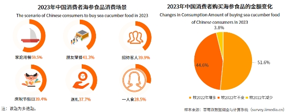 值得一提的是,除了满足消费者饮食需求之外,海参的社交属性也日益凸显。相较于蓝龙虾、鱼子酱等名贵食材,海参的定价较低;而相较于普通的海鲜产品或者药材,海参食品又具备一定的经济价值。因此,约四成的海参食品消费者选择将海参端上桌去招待客人以及与朋友聚餐时食用,还有37.7%的消费者选择用海参送礼。