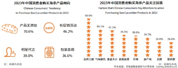 此外,海参产品的品质也是消费者主要关注的因素。iimedia research(艾媒咨询)调研数据显示,在购买海参产品关注因素方面,排名前五的分别是品质口感(68.6%)、气味颜色(49.1%)、重量大小(47.5%)、容易处理(39.5%)、价格(38.6%);在购买海参产品倾向方面,超七成消费者更愿意选购无添加剂的产品,名人效应与包装营销对其影响甚微。