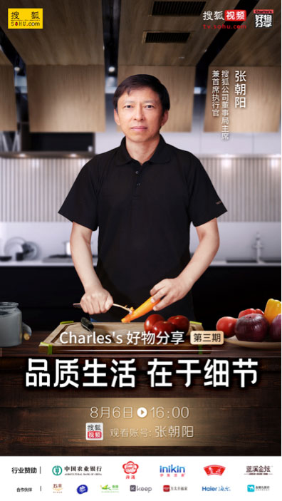 而第三期“charles的好物分享”将同样立足于生活分享,以情怀为出发点,传递张朝阳健康的生活方式和有细节、有品质的“生活家”态度,同时也将体现出搜狐视频直播平台的发展方向,不仅要直播带货,更是要带知识、带价值、带平台。