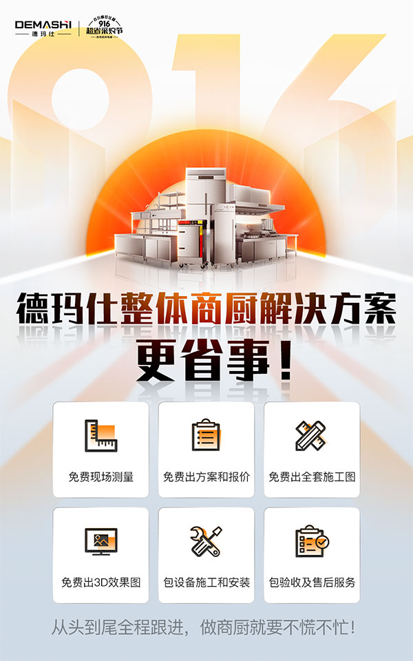 这次916超省采购节,德玛仕推出的5.98万商厨套餐更是诚意满满,相当给力。对德玛仕一站式整体商厨凯发娱乐官网的解决方案感兴趣的老板们,可趁着这波福利,及时关注“德玛仕”品牌动态,预约咨询。