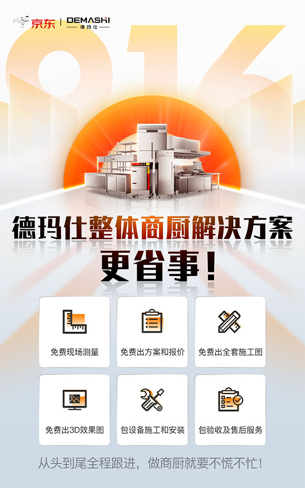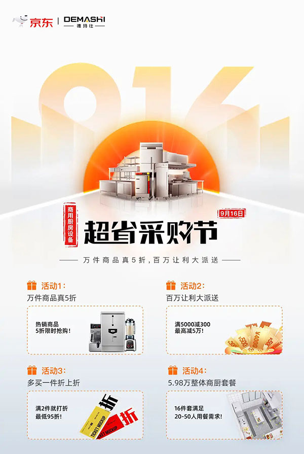 这不,德玛仕即将联合京东家电开启首届916超省采购节。9月16日,德玛仕豪送百万福利,为大家带来多重惊喜优惠,力求让采购人员低成本就能购置到高品质的商用厨房设备。