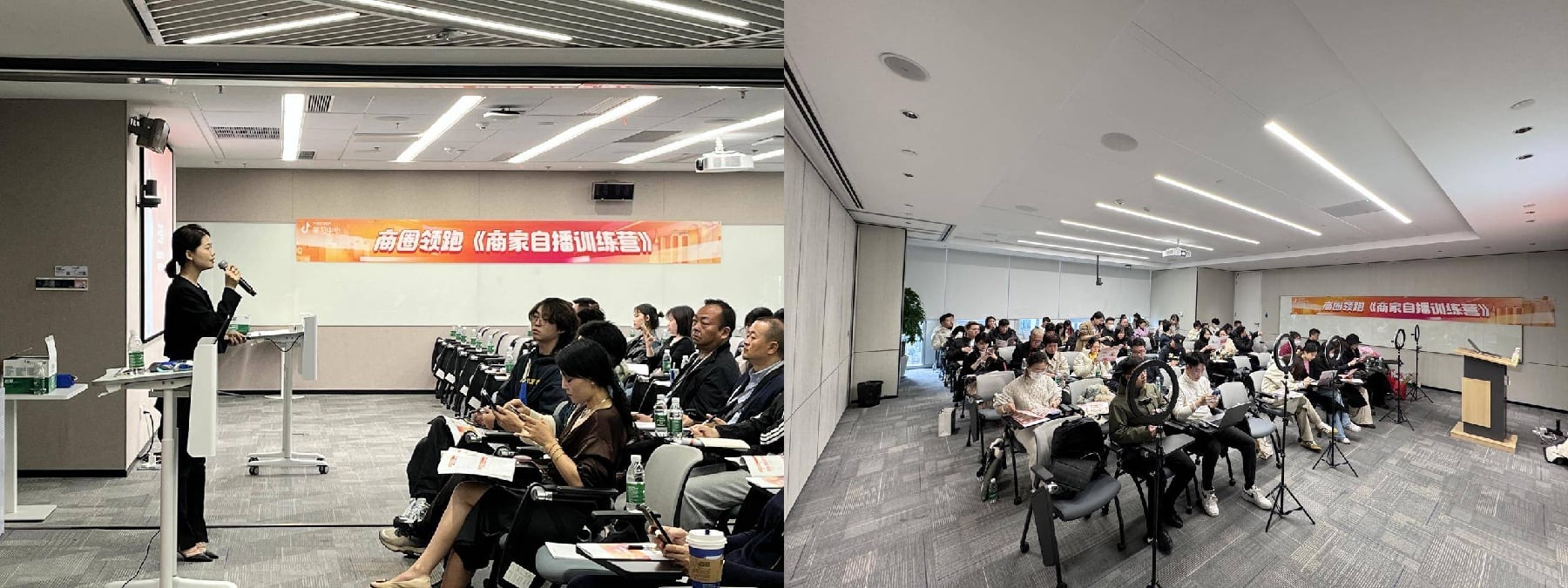 《商圈领跑·商家自播训练营》线下直播实操课程,从直播理论与实操两个方向对商家进行指导。课程的主要内容含理论教学、现场实操、答疑解惑几大块,将带给大家最干货的直播内容,最实用的直播实战话术,帮助0基础自播商户顺利切入自播赛道,为达成营业额跃迁、提高经营稳定性、沉淀品牌私域用户扬帆起航。
