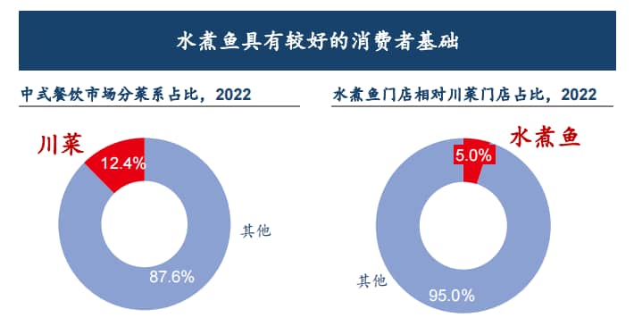 从《白皮书》中也能看到:水煮鱼市场正处于成长期。2022年,水煮鱼门店在川菜门店中占比约5%,仍有持续增长的空间。行业具备广泛的受众基础,市场需求量急剧上升,导致销售量相对稀缺,年复合增长率异常显著,创造了庞大的市场规模和持续增长的需求。