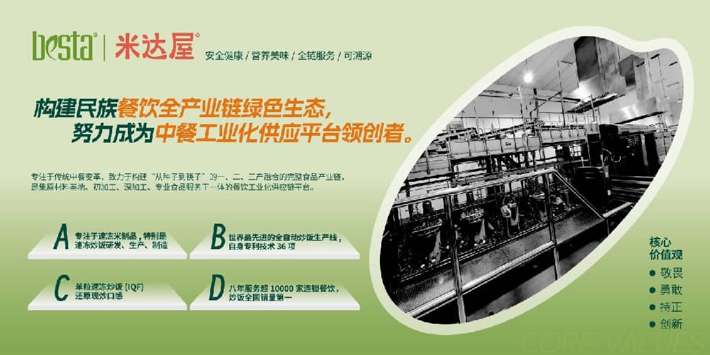 米达屋凭借其在速冻米制品领域的持续创新和卓越品质,在行业中脱颖而出成为引领行业发展的重要力量。品牌拥有先进的全自动炒饭生产线,掌握核心的 iqf 单粒速冻及米饭不反生技术,严格把控生产过程中的食品安全。从原料采购到生产加工,每一个环节都力求完美,确保为消费者提供既便捷又健康的美食选择。