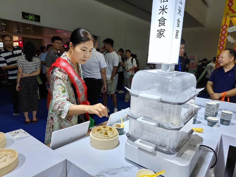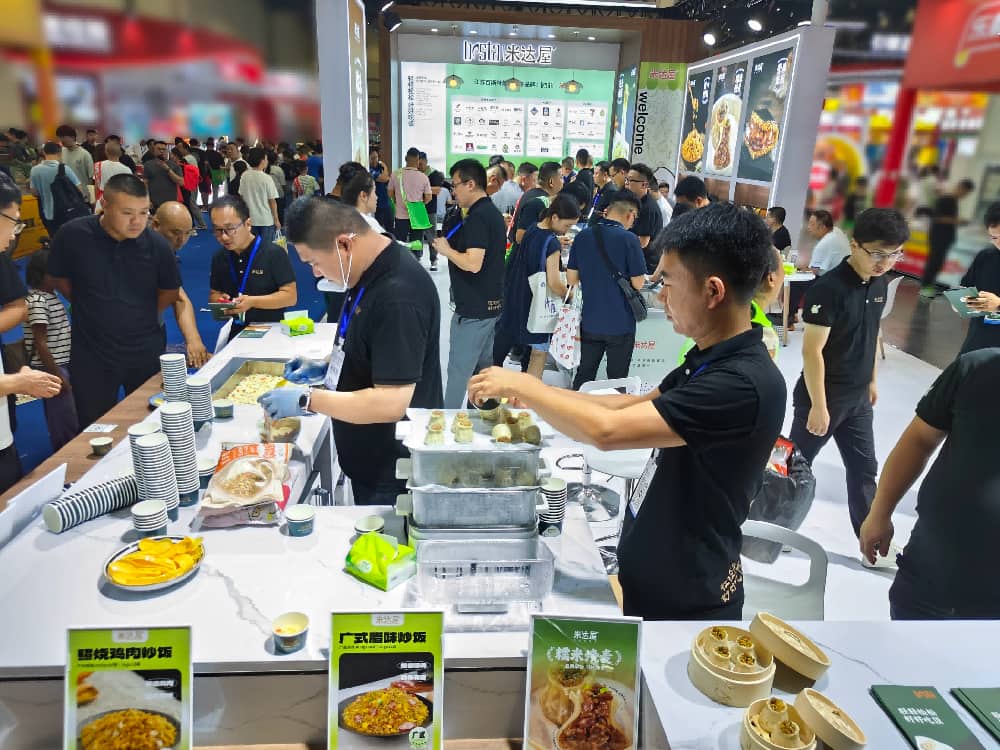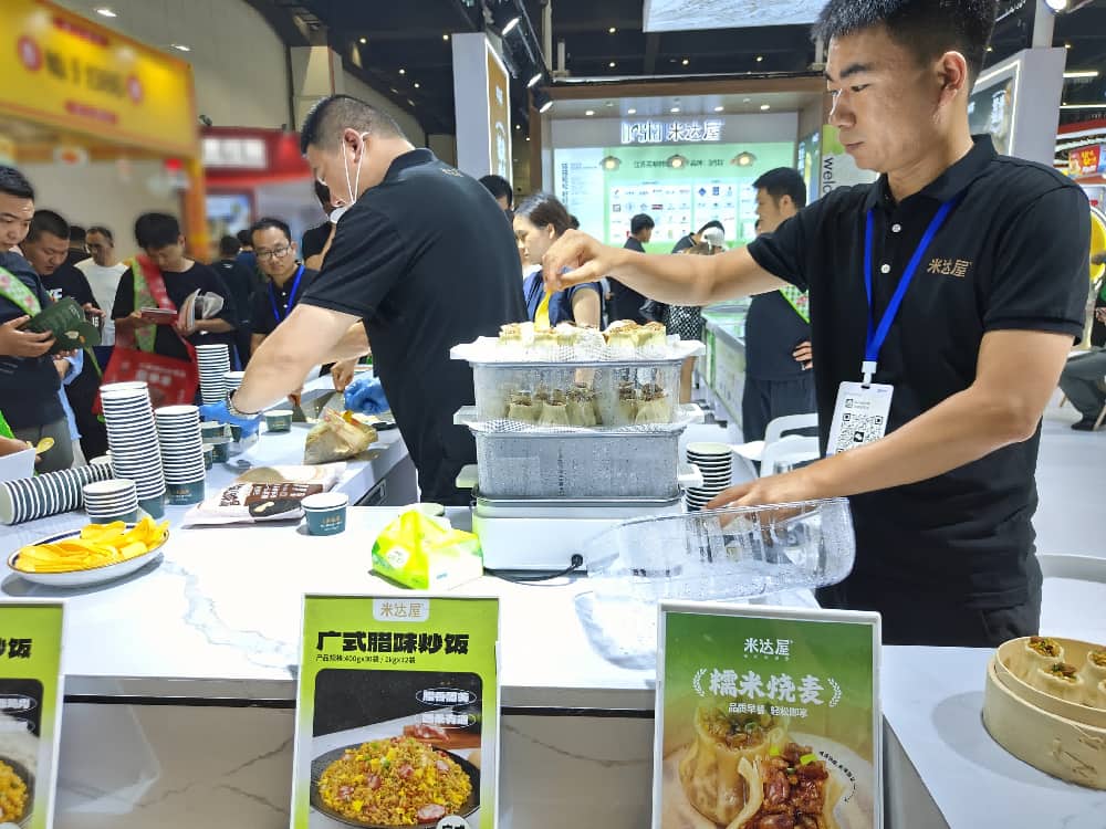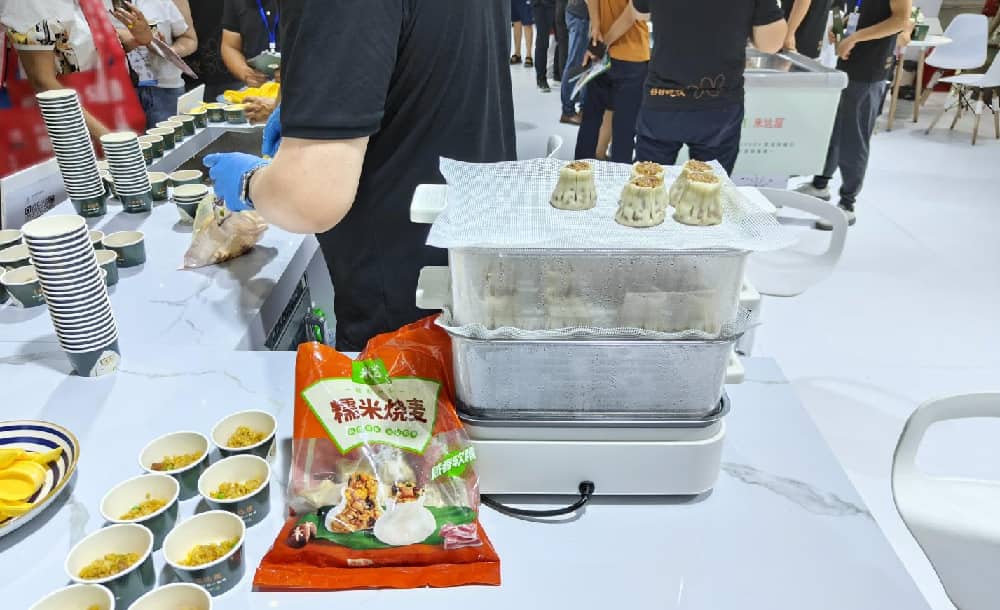 为了让参展商更直观地感受美食魅力,现场专门设置了烹制区。厨师们熟练操作,一系列动作行云流水。不一会儿,一份份香气扑鼻的炒饭和烧麦便新鲜出炉。米达屋的试吃区门庭若市,络绎不绝的人群被现场烹制的美味所吸引。
