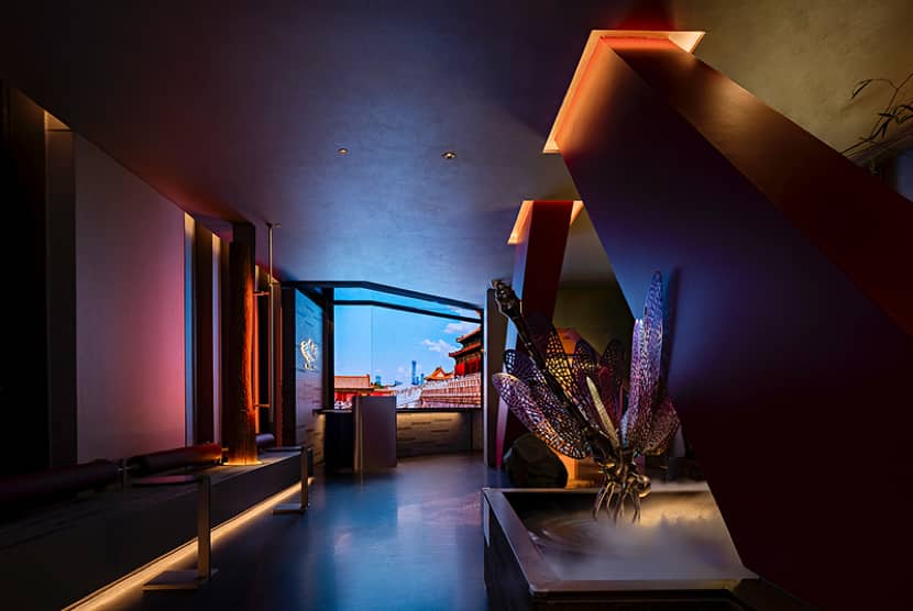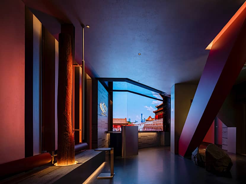 由入口至开放的散座区经过一段折廊,新旧北京的城市影像前,古老的木梁与重力感十足的倾斜结构体一古一今,利落轻盈的金属材料的加入为细部注入了现代感,等位区也不着刻意,延续了这一区域的体块互构又完全满足了实用性。山石水景皆以表意为主,打破传统的空间构成使这些自然风物有了更多观看视角。