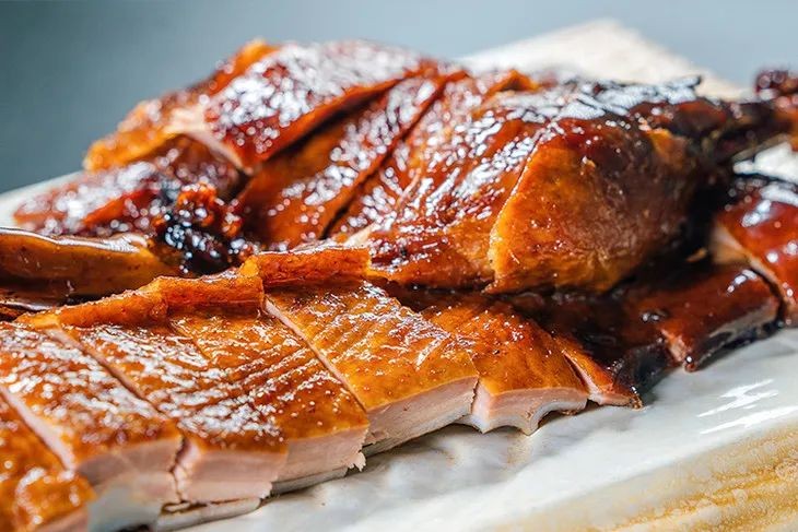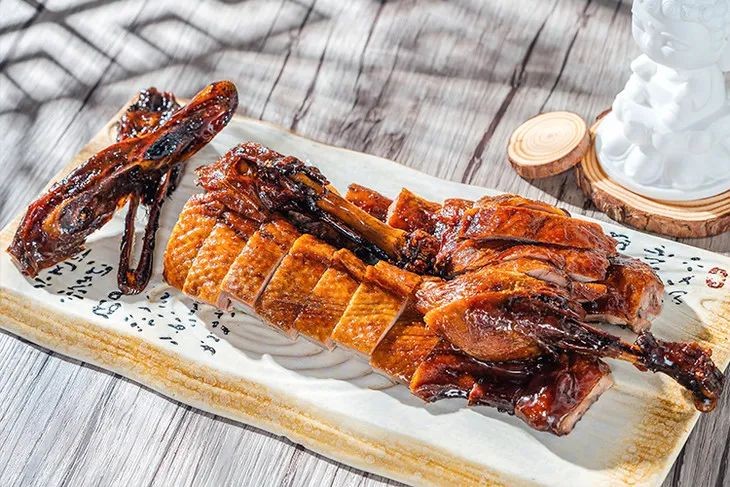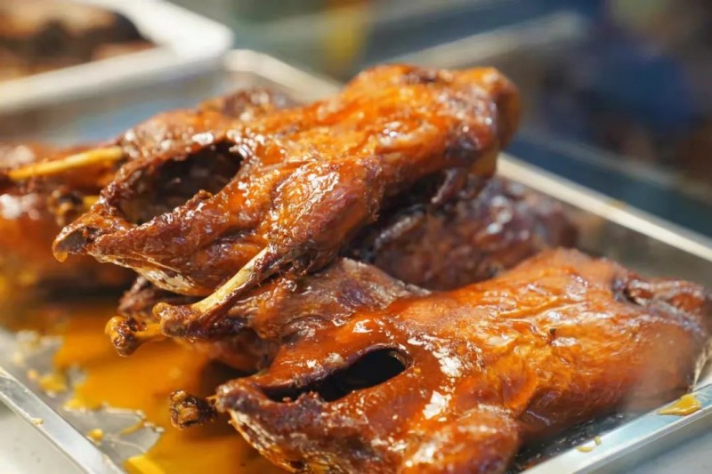 而在卤制环节,赵鸭子也做足了准备。赵鸭子的卤汤并不添加糖色、老抽等赋色调料,而是由老汤 新汤调制而成,色泽金黄,口感细腻。卤汤熬制好了之后,再将新鲜宰杀的麻鸭浸泡其中,文火慢卤,浓郁的卤香会随着时间逐渐渗透进鸭肉里。待鸭子卤到七八成熟之后再用滚油一勺勺地烫熟炸制,将肉香锁在内里,形成酥脆的外皮。最后再浓墨重彩刷上一层饴糖糖浆,让原本咸鲜焦脆的鸭皮,充分吸收香甜的味道,毫无半点鸭腥味。