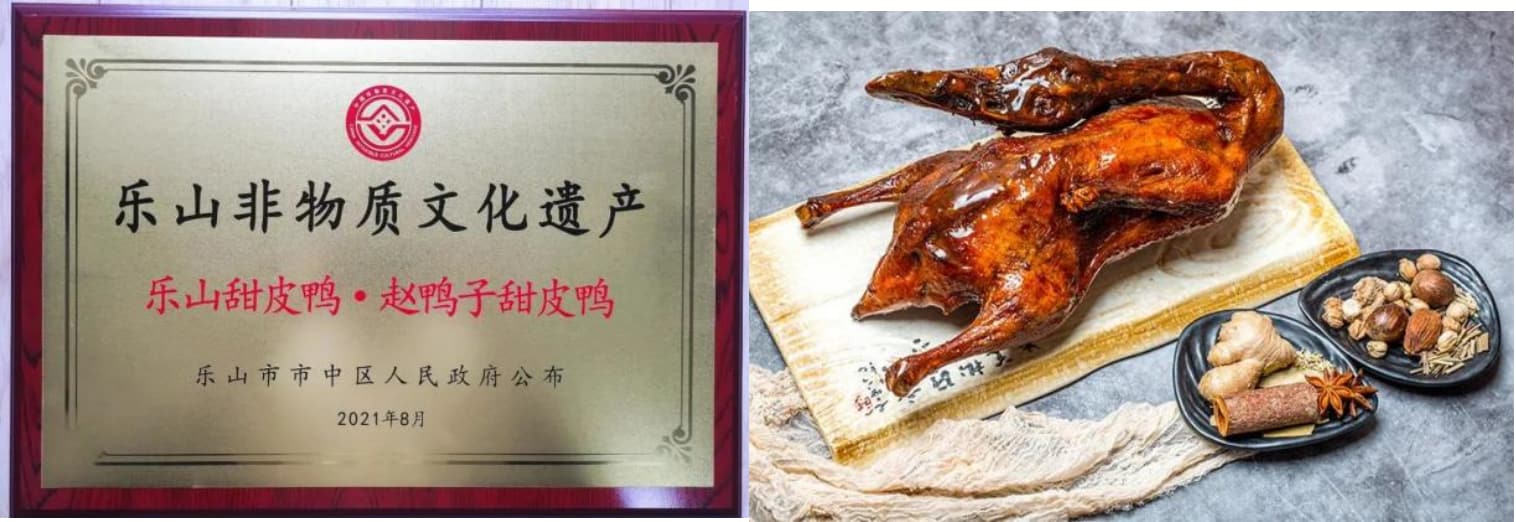 在乐山众多美食中,不能不提特产甜皮鸭。而赵鸭子甜皮鸭作为乐山特产甜皮鸭的代表品牌,绝对是一个独特的存在。从1939年初创至今,赵鸭子甜皮鸭已有85年历史,伴随着一代又一代乐山人成长,与乐山人的“甜味记忆”深度捆绑,不仅逐渐成为乐山的城市名片之一,还先后获得“乐山非物质文化遗产”的美誉。其色泽油润、外酥里嫩、甜香四溢的特征,使得赵鸭子甜皮鸭在乐山人的年夜饭上出镜率相当高,也是乐山人走亲访友的“必备佳礼”。