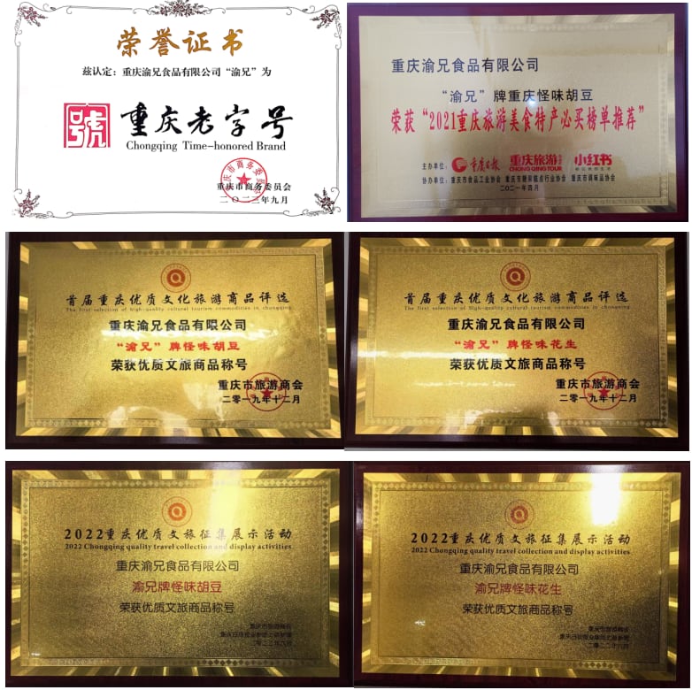 深耕行业多年,“渝兄”品牌不仅赢得了市场和消费者青睐,也获得了行业内的高度认可与肯定。旗下“渝兄”牌怪味胡豆、“渝兄”牌怪味花生在2019年荣获“优质文旅商品称号”,“渝兄”牌重庆怪味胡豆则荣耀上榜“2021年重庆旅游美食特产必买榜单推荐”,其品牌知名度和美誉度进一步提升。2022年,“渝兄”牌怪味胡豆、怪味花生再次荣获“优质文旅商品称号”同时被授权使用“重庆优质文化旅游商品”标志。2023年,重庆市商务委员会授予“渝兄”牌怪味胡豆《重庆老字号》称号。而在此之前,“渝兄”品牌也已连续多年获得过重庆市相关机构年度评选优胜和重点产品(品牌)推荐等行业内的诸多殊荣。