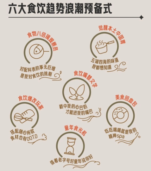 《报告》显示,当下消费者在食品饮料产品的选择上,往往围绕“我”的需求,聚焦真材实料、良善功效,呈现出化身“食物八倍镜观察员”的趋势,且随着人们健康意识提升以及自我关爱意识的觉醒,情绪健康的需求日益突出,消费者开始愈发重视食品饮料带来的情绪价值,也成为消费者个人特征的显性符号,越来越多的消费者希望通过食品饮料来彰显个性,《报告》中总结为“食饮嘴替文学”、“美食回血包”等趋势。